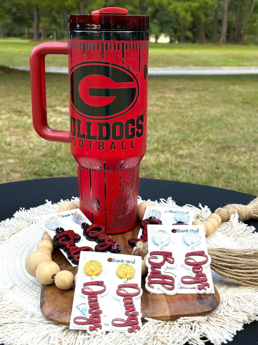 Georgia game day essentials, 40 oz unbranded tumbler, red with black engraving with a Georgia football theme, tailgate essentials, school spirit, gameday drinkware, sick um, glory glory, DAWGS