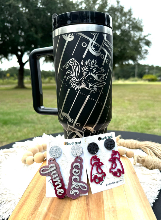 South Carolina Gamecock gameday accessories| GO COCKS| USofC| USC| GAMECOCKS| 40 oz black unbranded, stainless steel with silver engrave, Gamecock football theme, gift for the ultimate Gamecock fan