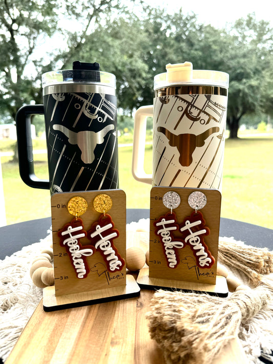 Texas longhorn game day essentials, 40 oz unbranded tumbler, black or white lasered engraved with a Texan longhorn football theme, tailgate essentials, school spirit, gameday drinkware, Hook um Horns,