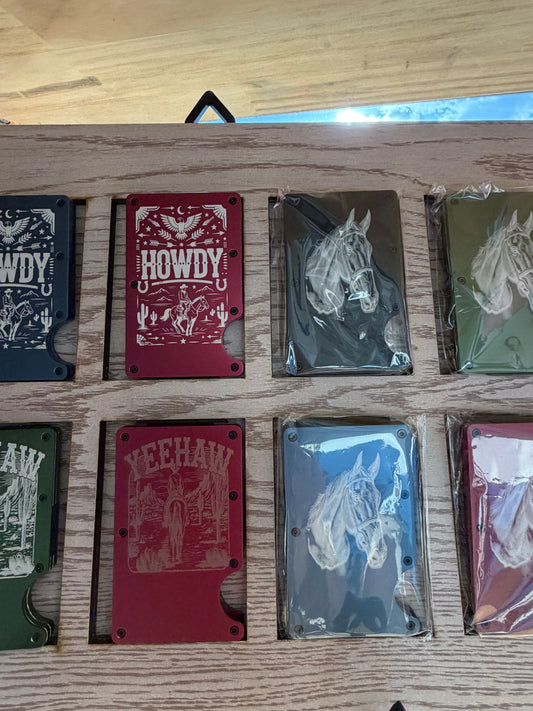 Crafted from high-quality materials and engraved with unique designs—from western sayings like “Howdy,” cowboy and horse artwork, wildlife themes, and custom graphics—each wallet adds personality while keeping your essentials organized.