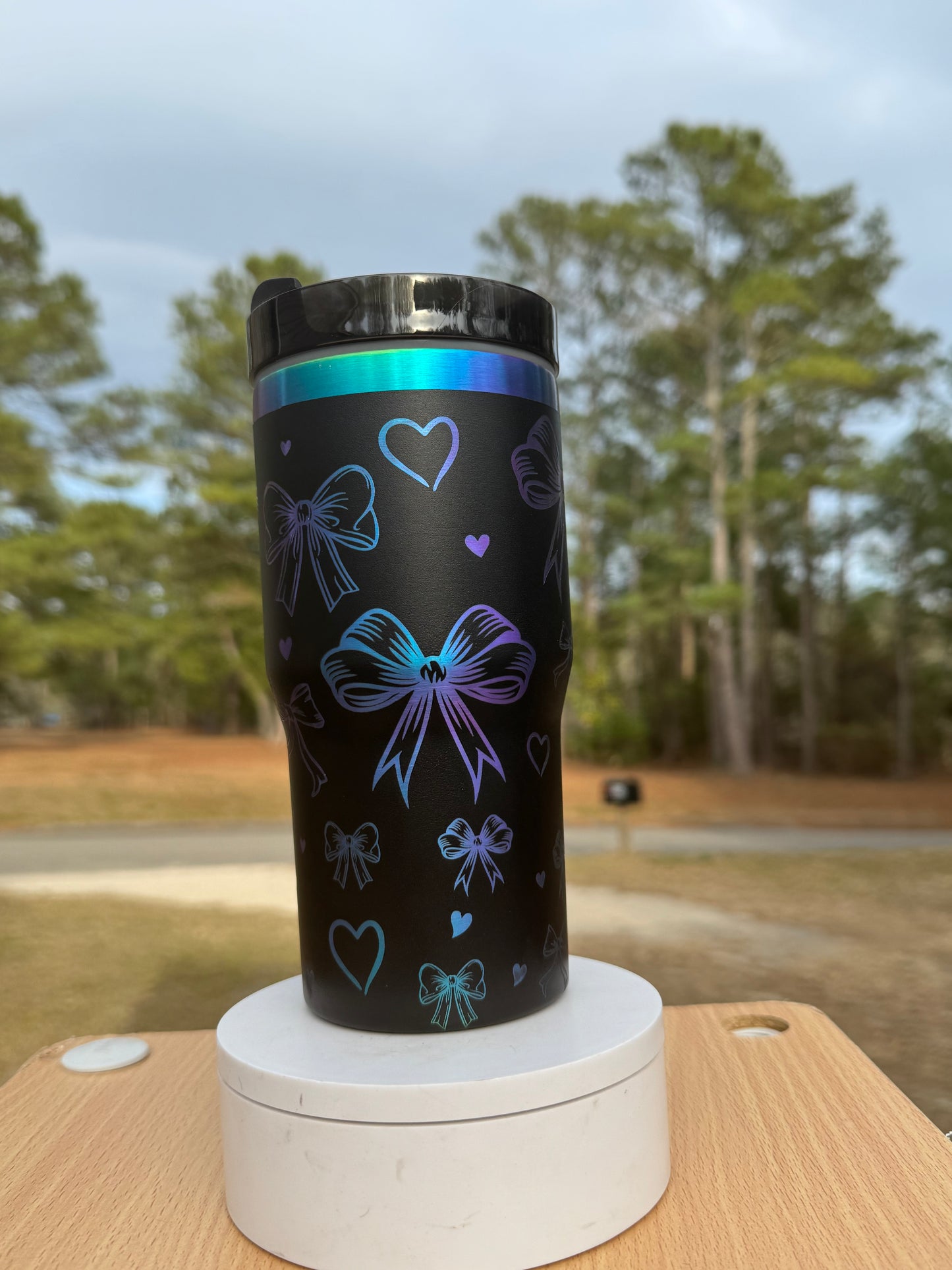 Elevate your daily routine with this trendy 20 oz stainless steel tumbler featuring a coquette bow aesthetic. Designed for those who love a touch of elegance, this black matte tumbler with purple and pink base showcases delicate hand-drawn bows and hearts, giving it a soft and feminine feel.