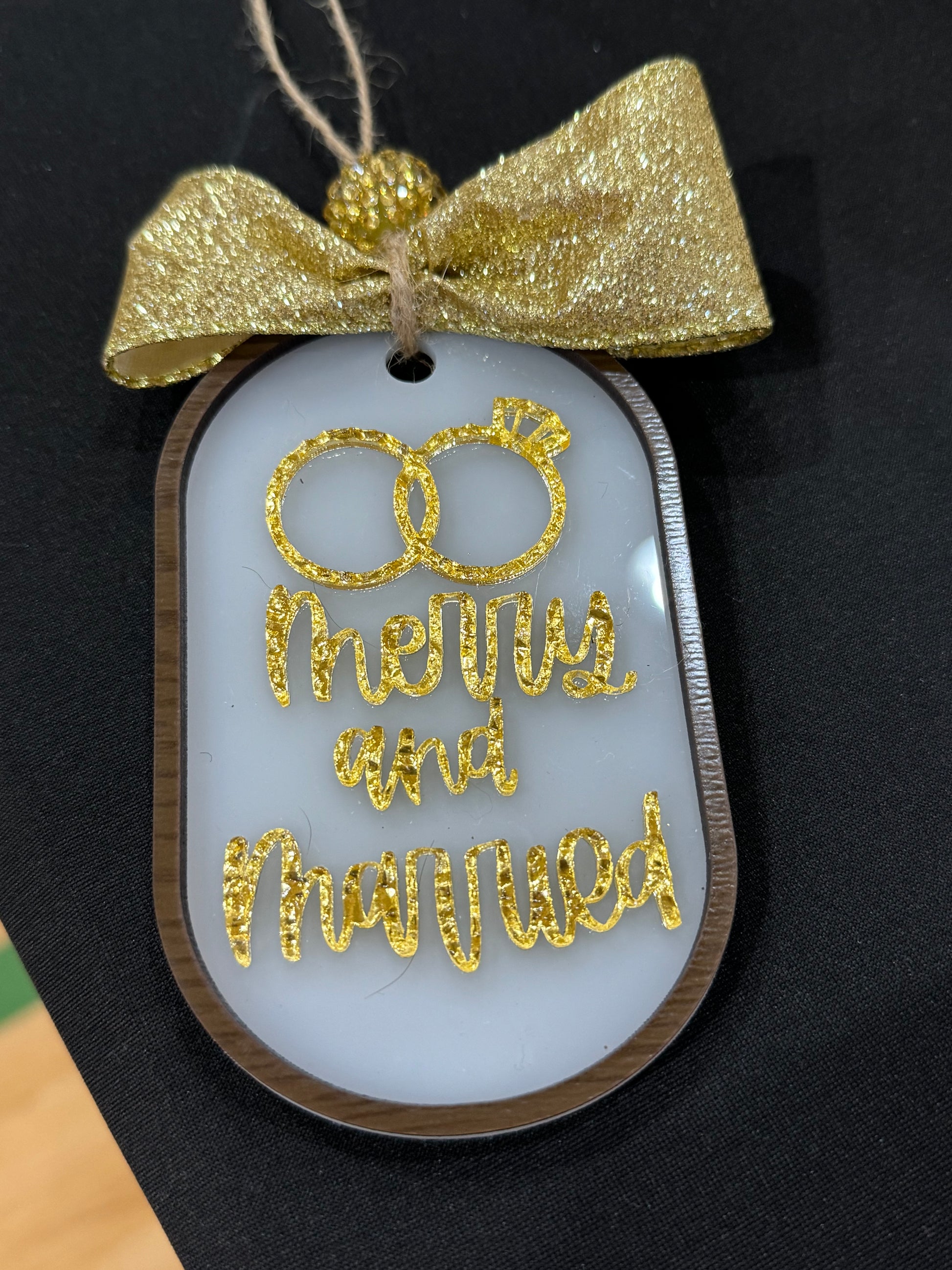 Celebrate your first holiday season as newlyweds with our beautifully handcrafted "Merry and Married" Christmas ornament! This elegant piece features glittery gold lettering and interlocking wedding rings on a white background, framed with wood-look acrylic for a modern farmhouse touch. Finished with a sparkly gold bow and rustic twine for easy hanging, it’s the perfect gift for newlyweds, bridal showers, or wedding anniversaries.