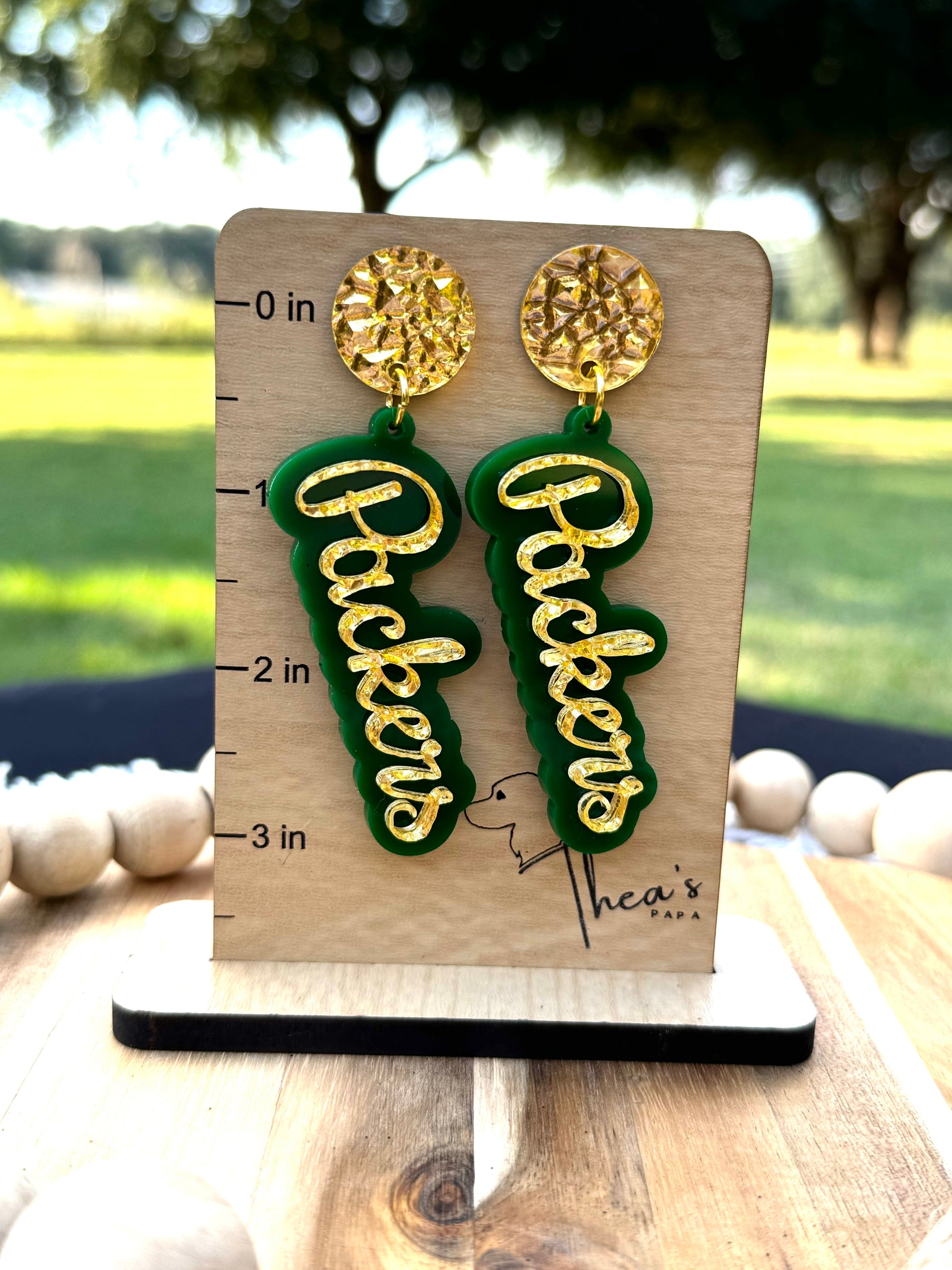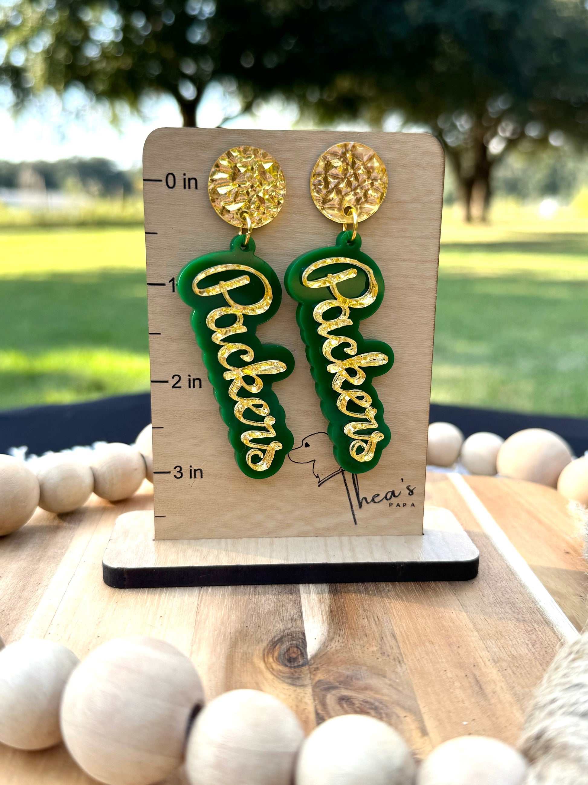 Packers earrings, Gameday statement earrings, Spirit earrings, Cheeseheads, Lamheau field, GO PACK GO