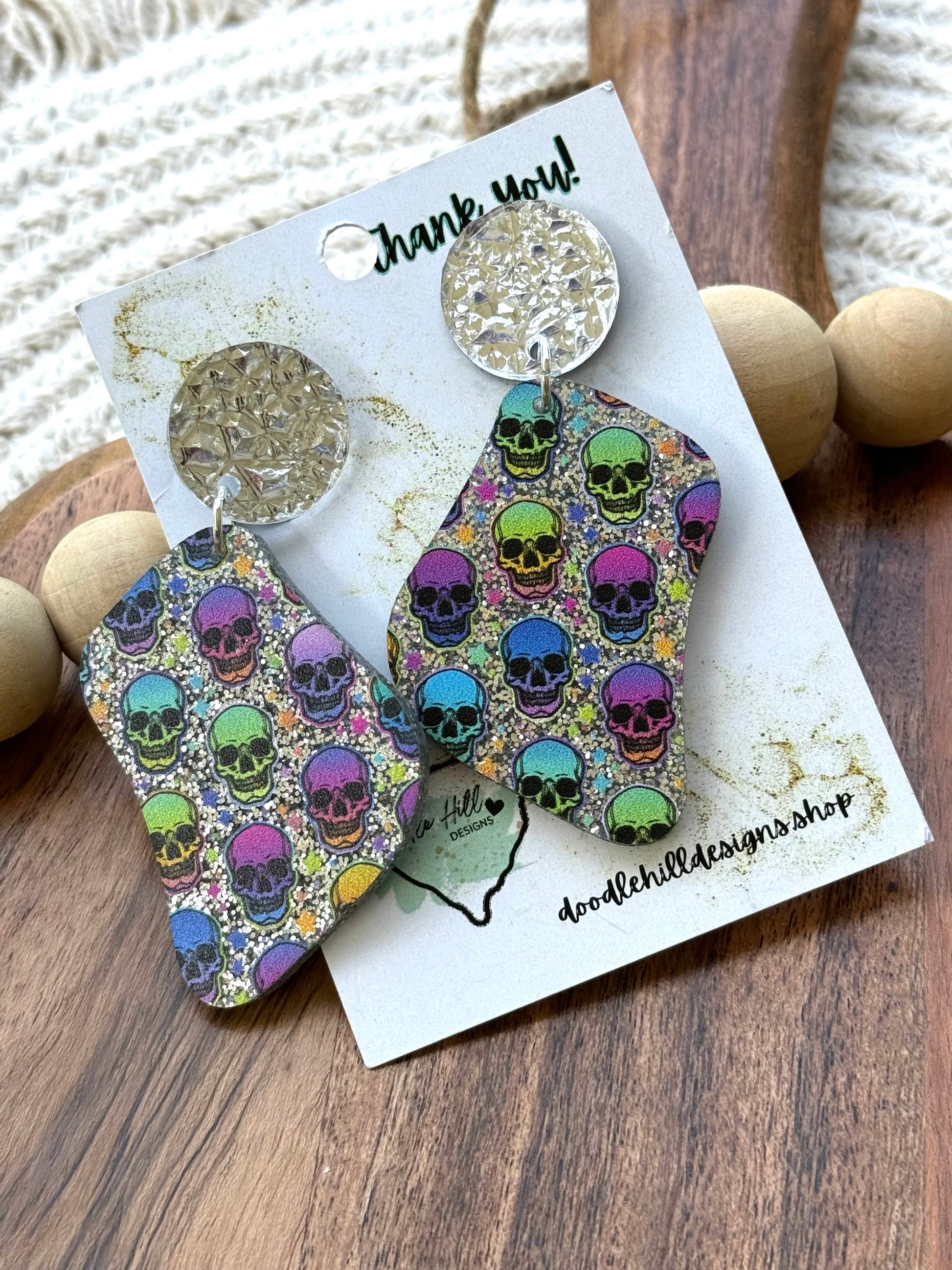 Rainbow Sugar Skull Acrylic Earrings – Silver Glitter Base